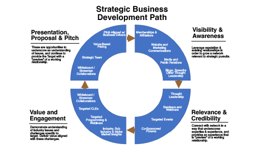 With the caveat that there isn’t a cookie-cutter that fits every situation, a successful business development plan will create sustained visibility, deliver measurable value to the target, and facilitate the opportunity for a face-to-face pitch. While the specifics for how to execute at each phase will vary, this graphic is offered as an initial way to think about the path your efforts follow.